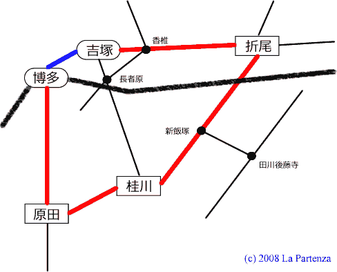 博多→(鹿児島本線)→原田→(筑豊本線)→桂川→(福北ゆたか線)→折尾→(鹿児島本線)→吉塚